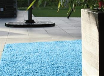 Græstæppe i blåt plasticgræs – udendørs gulvtæppe.